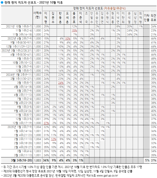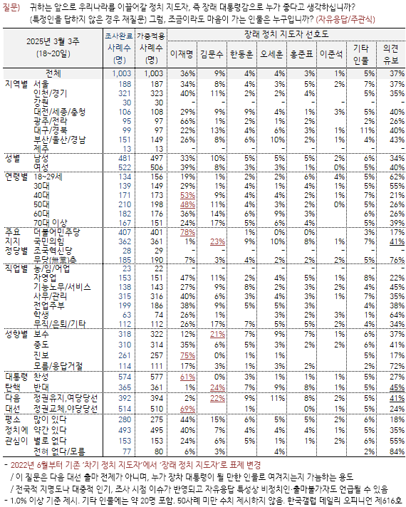 한국갤럽이 2025년 3월 18~20일 전국 유권자 1,003명에게 앞으로 우리나라를 이끌어갈 정치 지도자, 즉 장래 대통령감으로 누가 좋다고 생각하는지 물었다.