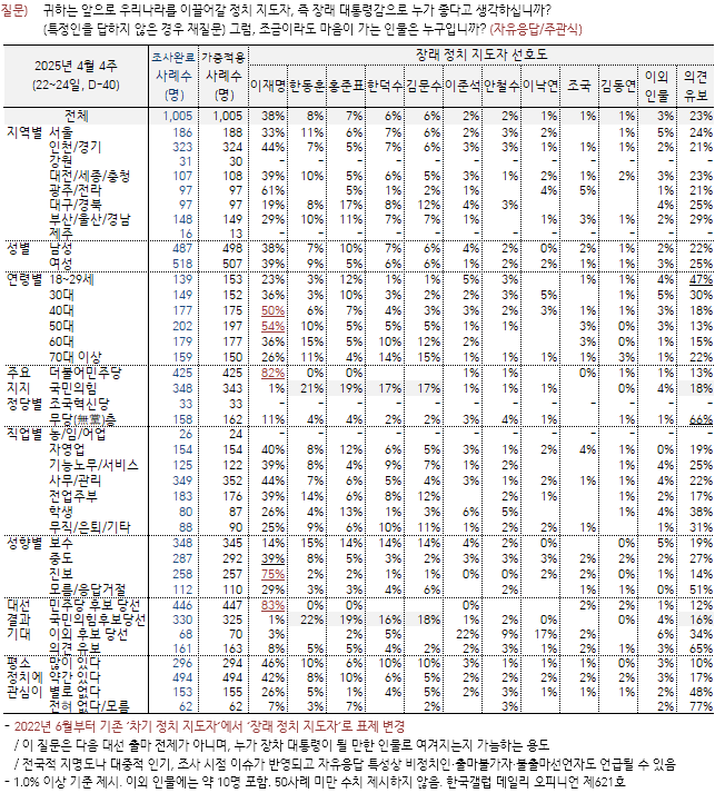 2025년 4월 25일 한국갤럽 여론조사 결과 : 이재명 38%, 한동훈 8%, 홍준표 7%,한덕수와 김문수 각각 6%
