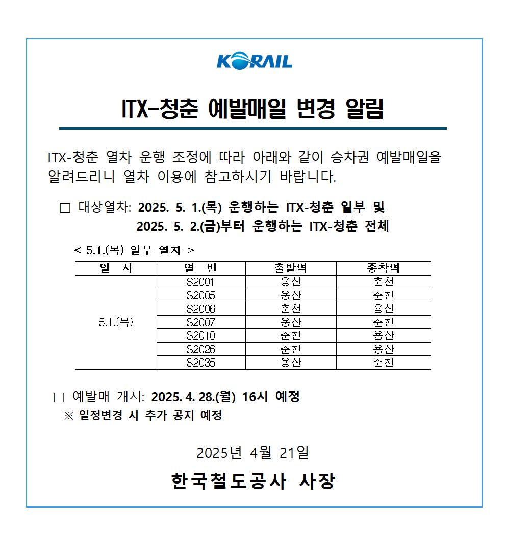 ITX-청춘 5월 황금연휴 시간표 조정에서 따라 중단되었던 예발매를 오늘(28일) 오후 4시 이후 할 예정입니다.