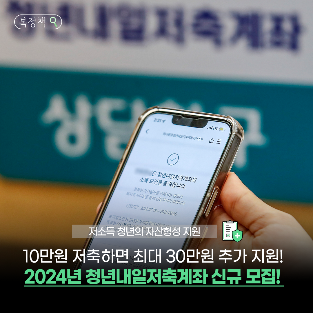 “일하면서 저축하면 정부가 3배로 불려준다?” 청년내일저축계좌는 저소득 근로청년이 자산을 형성할 수 있도록 정부가 매달 지원금을 더해주는 제도입니다. 일정 기간 성실히 일하고 저축하면 목돈 마련이 가능합니다.