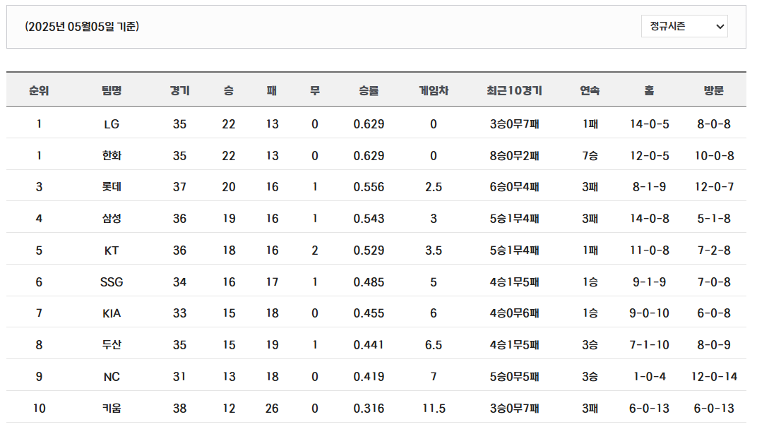 2025 KBO리그 순위(5.5)...LG, 한화 공동 1위 본문