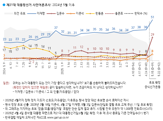 | 한국갤럽 | 2025년 5월 3주 | 51% | 29% | 8% |