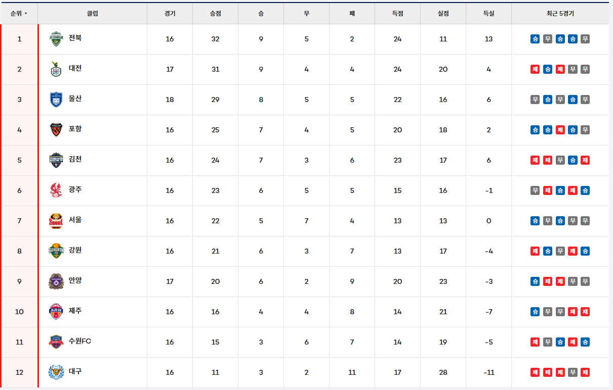 | 2 | 대전 하나 시티즌 | 31 | 9-4-4 | +4 |