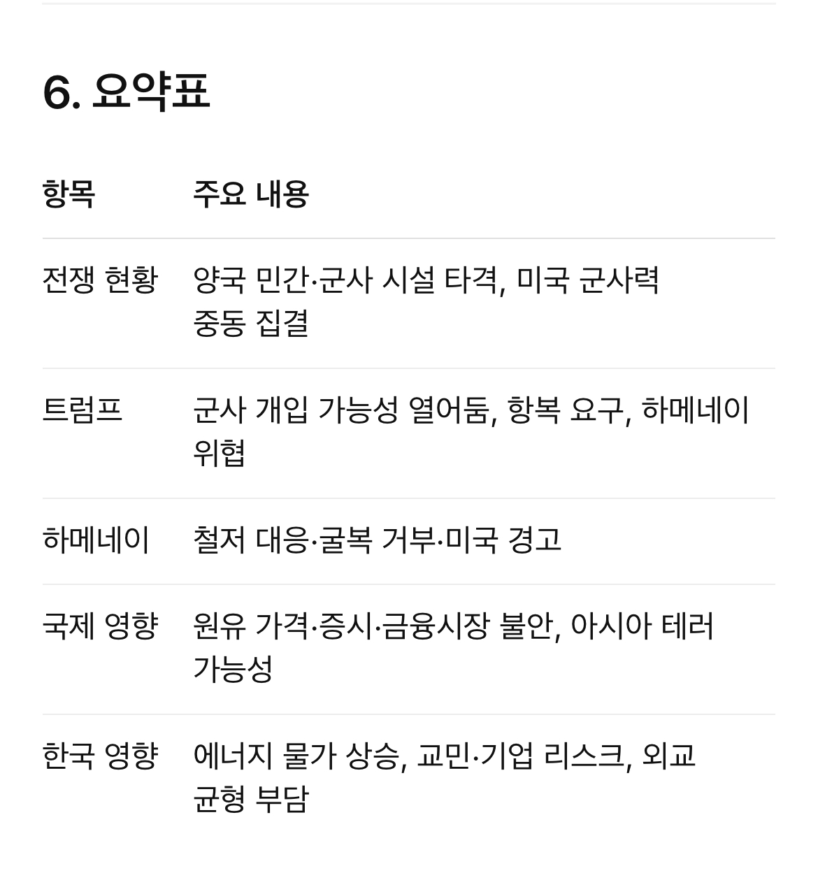 아래는 2025년 6월 중순 현재, 이스라엘-이란 전쟁 상황과 트럼프 전 대통령 및 하메네이 성명, 그리고 세계 및 대한민국에 미치는 영향을 다각도로 분석한 보고서입니다.