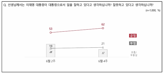 6월 2주차 NBS 조사에서 이재명 대통령의 국정 수행 긍정 평가는 53%였으나, 6월 4주차 조사(23~25일 기준)에서는 62%로 상승했다. 이는 불과 2주 만에 9%포인트 반등한 수치로, 시정연설과 추경 메시지에 대한 대중의 긍정 반응이 반영된 결과로 해석된다.