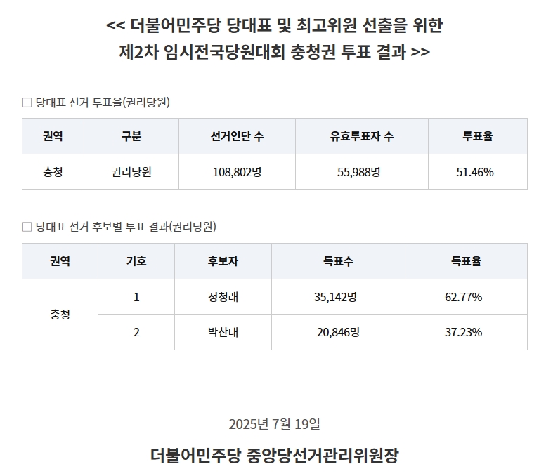 더불어민주당 당대표 및 최고위원 선거 충청권 첫 온라인 투표 결과 : 정청래 62.77%, 박찬대 37.23% – 세널리 정치 정국분석 7월 19일 본문