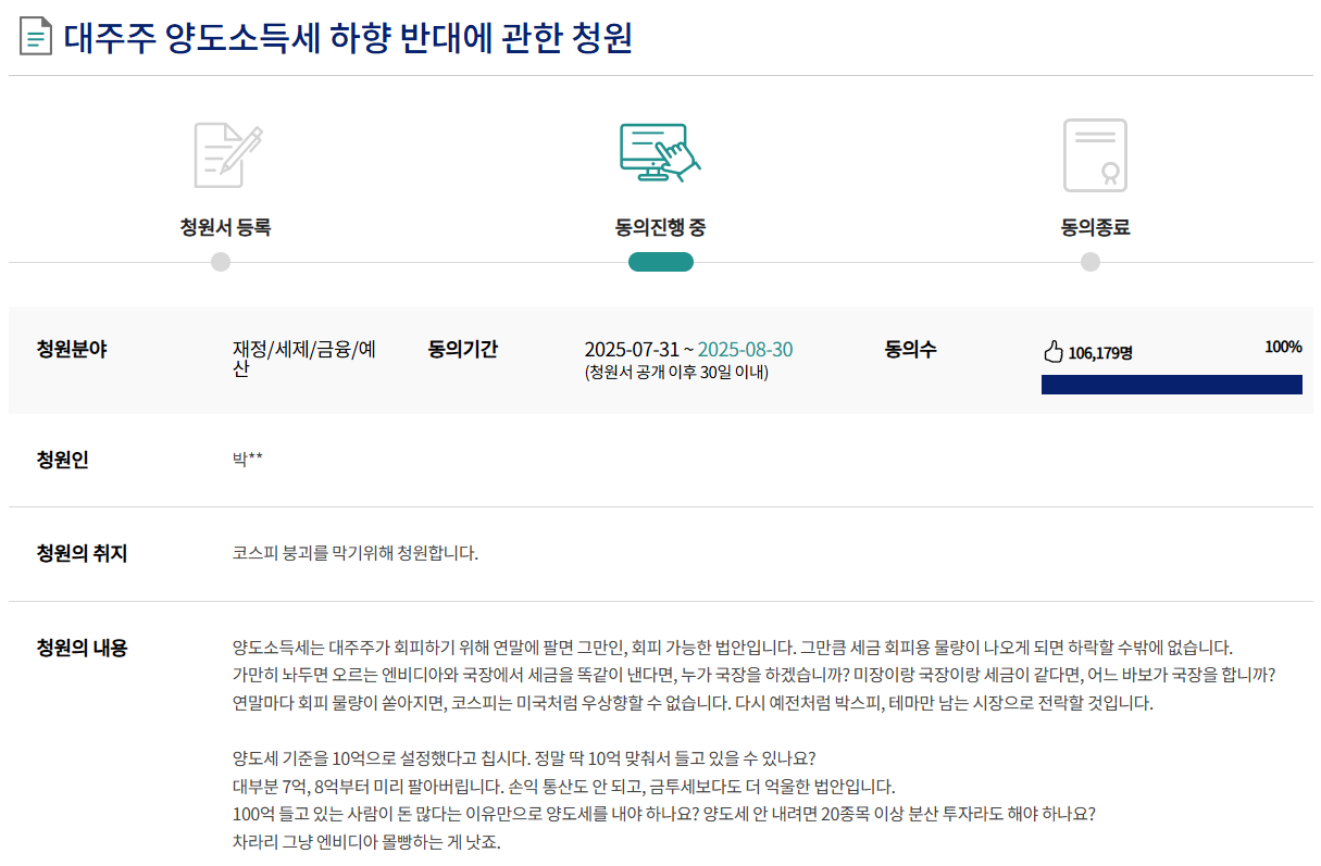 개인투자자들은 즉각 반발했다. 국민청원에는 “국내 시장을 죽이는 정책”이라는 비판이 쏟아졌고, 하루 만에 5만 명 이상 동의가 몰렸다. “미국은 양도세 면제인데 한국은 중산층에게까지 대주주 세금을 매긴다”는 불만도 제기됐다. 투자 커뮤니티에서는 연말 절세 매도 확대와 장기적 국내 증시 이탈 가능성이 우려되고 있다.