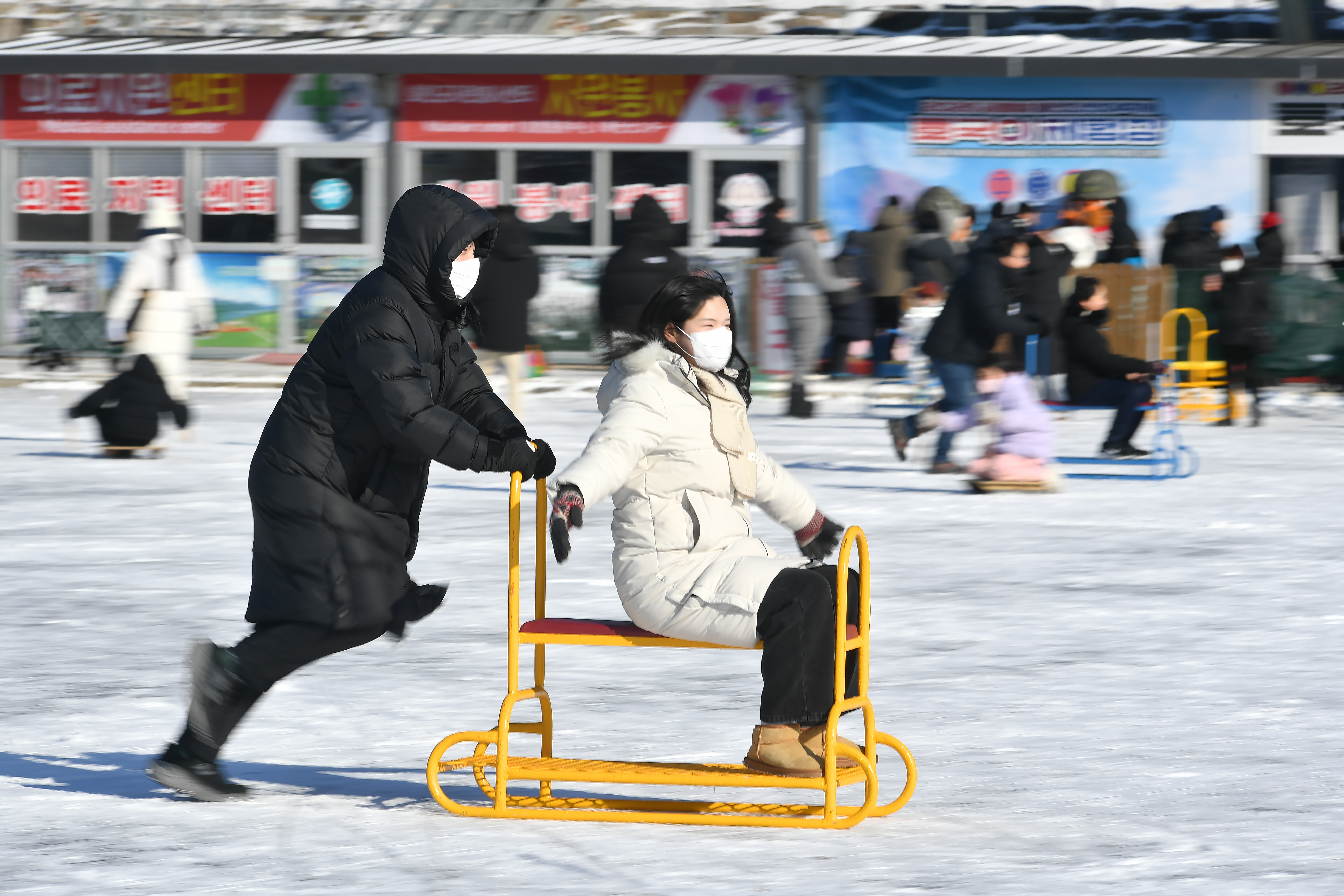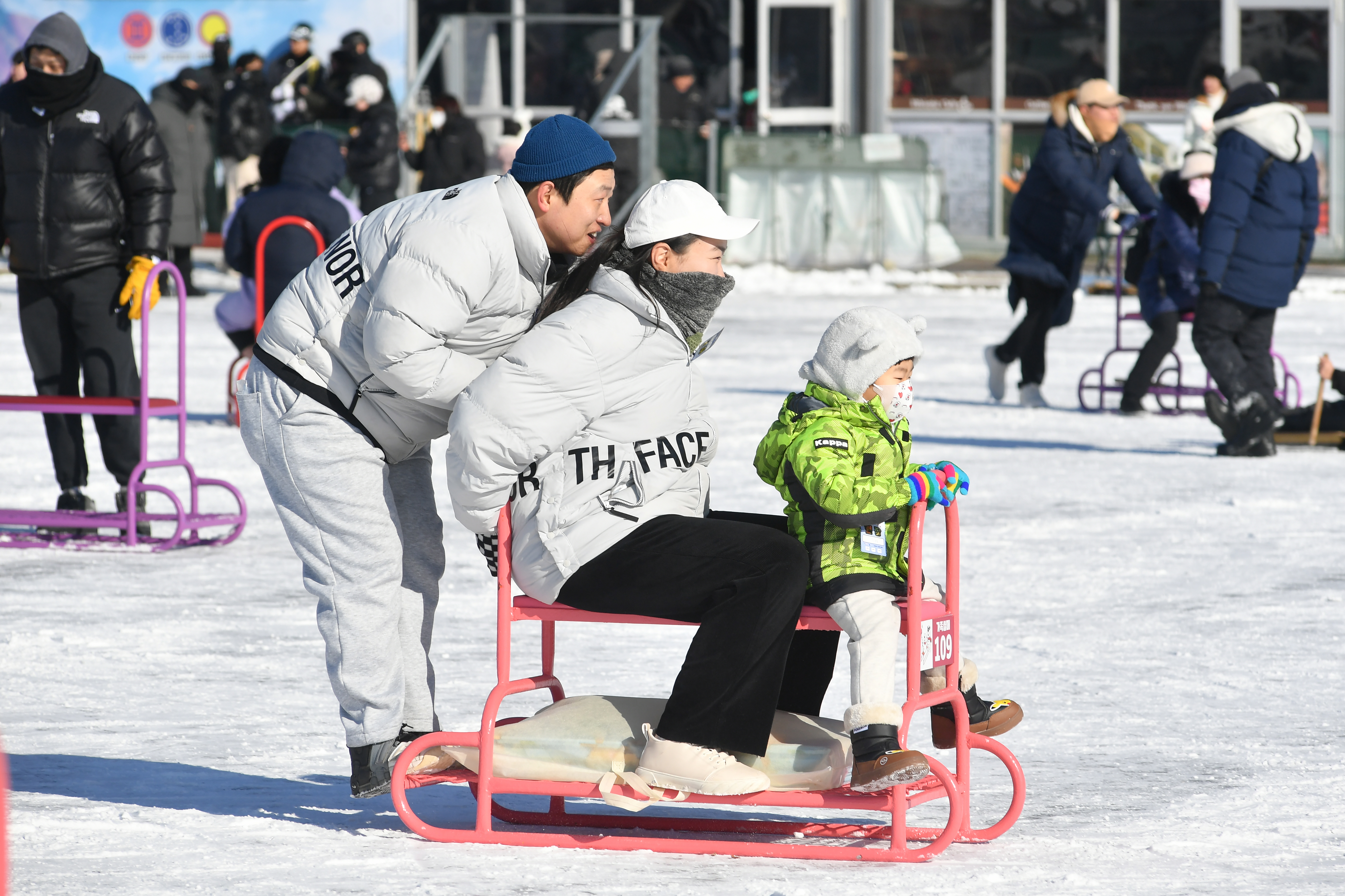 2026 화천산천어축제 개막 이틀 째인 11일, 축제장을 찾은 가족 단위 관광객들이 축제장에 마련된 겨울 문화촌, 얼음낚시터, 얼음썰매에서 즐거운 시간을 보내고 있다.