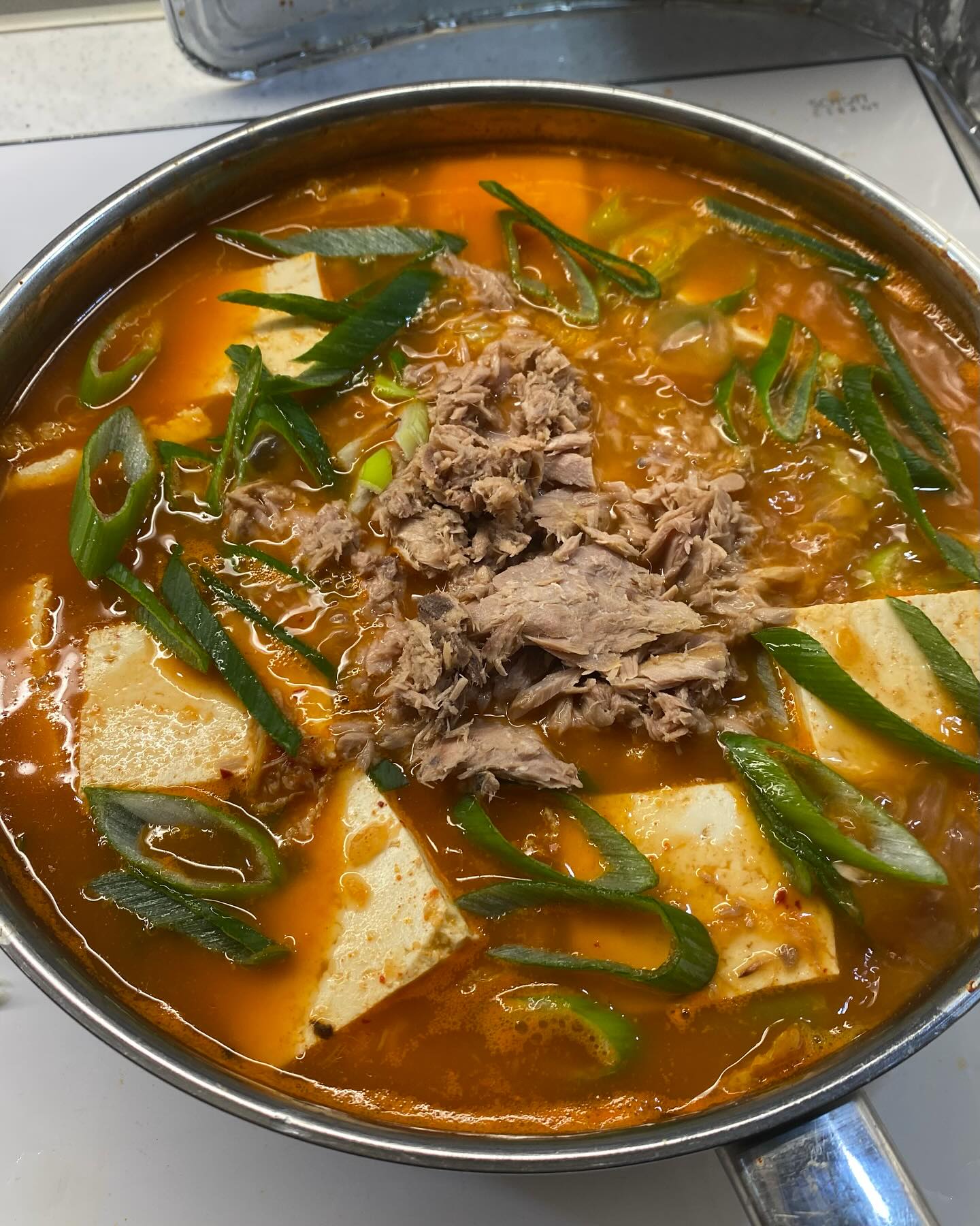 - 참치를 넣고 2분 더 끓인 뒤, 두부를 큼직하게 넣어 3~4분 마무리.