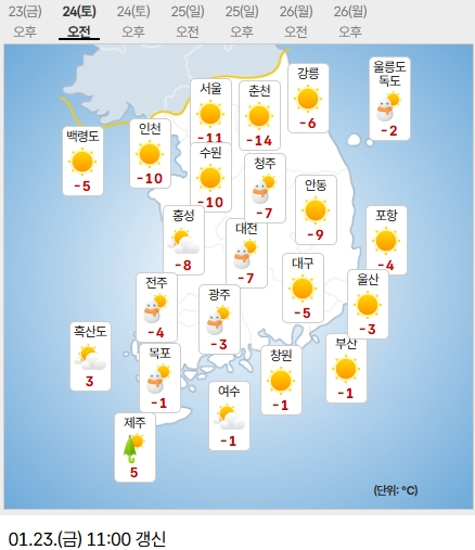 | 토(1/24) | -2 / -12℃ · 맑고 선선 |