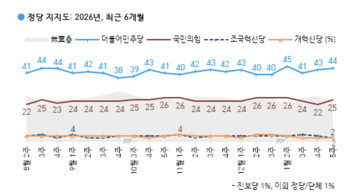 • 1월 5주: 민주당 44%, 국민의힘 25%, 조국혁신당 2%, 개혁신당 2%, 진보당 1%, 무당층 24%
