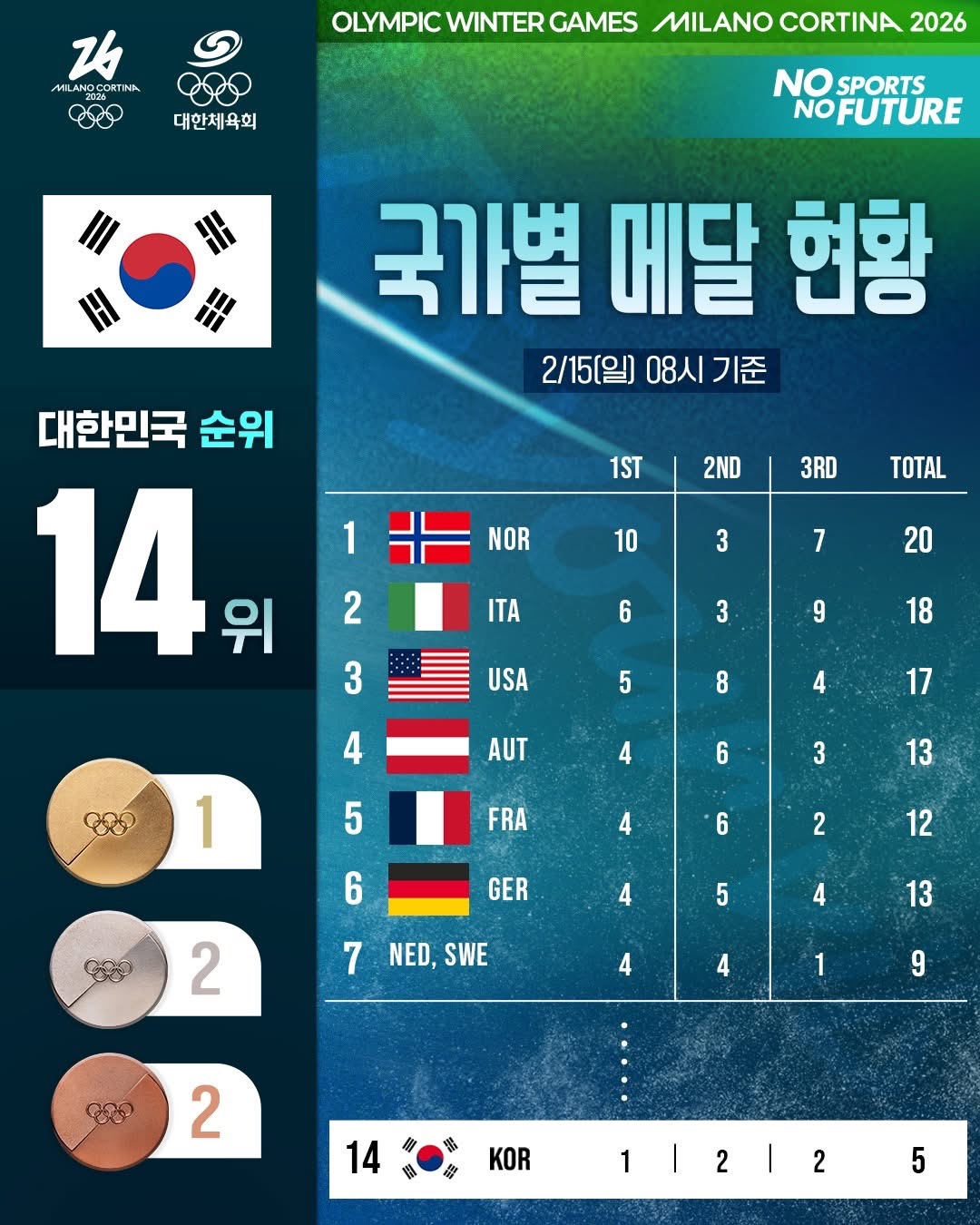 🇰🇷 밀라노·코르티나 동계올림픽 한국팀 성적 & 향후 주요경기 (2026.02.15 기준) 본문