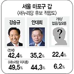 [설날특집] 20대 총선 판세 여론조사 [2] '스윙 스테이트' 서울 마포갑- 與 후보 적합도조사, 안대희 열세온라인 기사 2016.02.04 16:25 [일요신문] -'與 후보 적합도조사' 강승규 42.4% VS 안대희 35.2% -'가상대결1' 강승규 41.6% VS 노웅래 45.3% -'가상대결2' 안대희 36.2% VS 노웅래 52.8% [서울 마포갑] 서울 마포갑은 한국판 ‘스윙 스테이트’다. 스윙 스테이트는 미국에서 정치적 성향이 뚜렷하지 않아 부동층이 많은 지역을 뜻한다. 역대 전적은 2승 2패. 여야가 번갈아 깃발을 꽂았다. 현역인 노웅래 더민주 의원이 2승의 주인공이다. 여기에 안대희 전 대법관이 새누리당 간판으로 출마를 선언해 분위기가 달아오르고 있다. 지난 18대 총선에서 노 의원을 ..