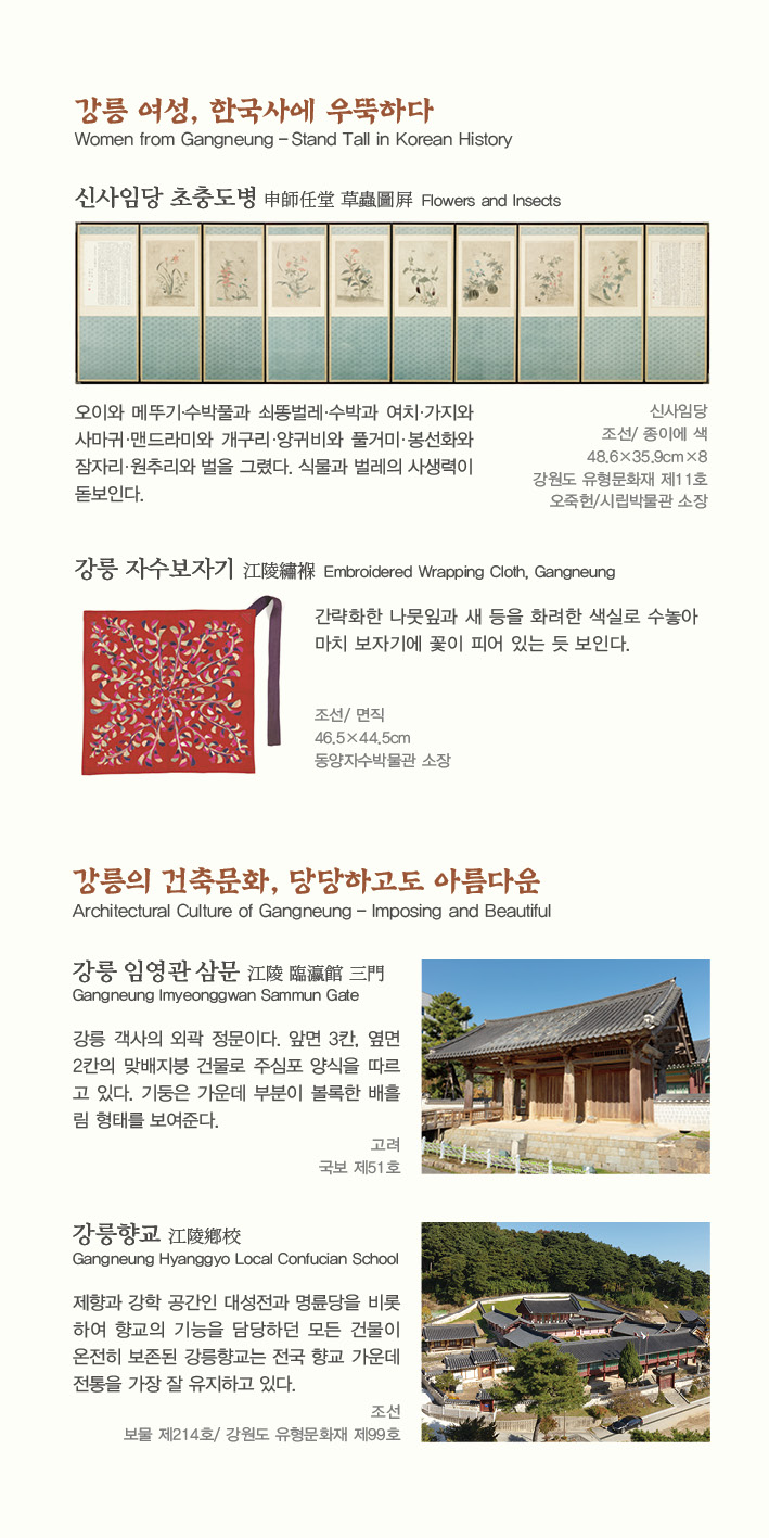 전시는 <강릉 여성, 한국사에 우뚝하다>, <강릉의 건축문화, 당당하고도 아름다운>, <강릉의 불교문화, 빛나는 깨달음의 집 사찰>, <강릉을 마음에 담은 선비>, <강릉에서 만난 공주, 명안> 등 다섯 개 섹션으로 구성되며, 한송사지 석조보살좌상(보물 제81호), 이이 수고본 격몽요결(보물 제602호), 문무잡과방목(보물 제603호), 명안공주 관련유물(보물 제1220호), 율곡 벼루(강원도 유형문화재 제10호), 신사임당 초충도병(강원도 유형문화재 제11호), 강릉 자수보자기 등 80여 점의 유물을 선보인다.