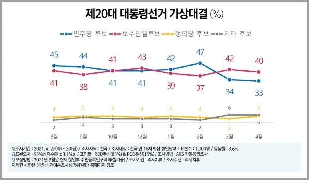 통계보정은 2021년 3월 말 현재 국가 주민등록인구통계에 따라 성ㆍ연령ㆍ지역별 가중치를 부여했고, 표본오차는 95% 신뢰수준에 ±3.1%p, 응답률은 3.6%다. 보다 자세한 내용은 <리서치뷰> 블로그와 <중앙선거여론조사심의위원회> 홈페이지 등에서 확인할 수 있다.