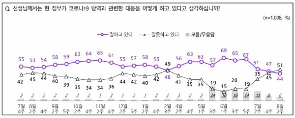 정부의 코로나19 방역 대응에 대해 ‘잘하고 있다’라는 긍정적 평가는 44%, ‘잘못하고 있다’라는 부정적 평가는 51%로 나타났다. 7월 2주차부터 ‘부정적 평가’가 지속적으로 높아지고 있는 것으로 나타났다.
