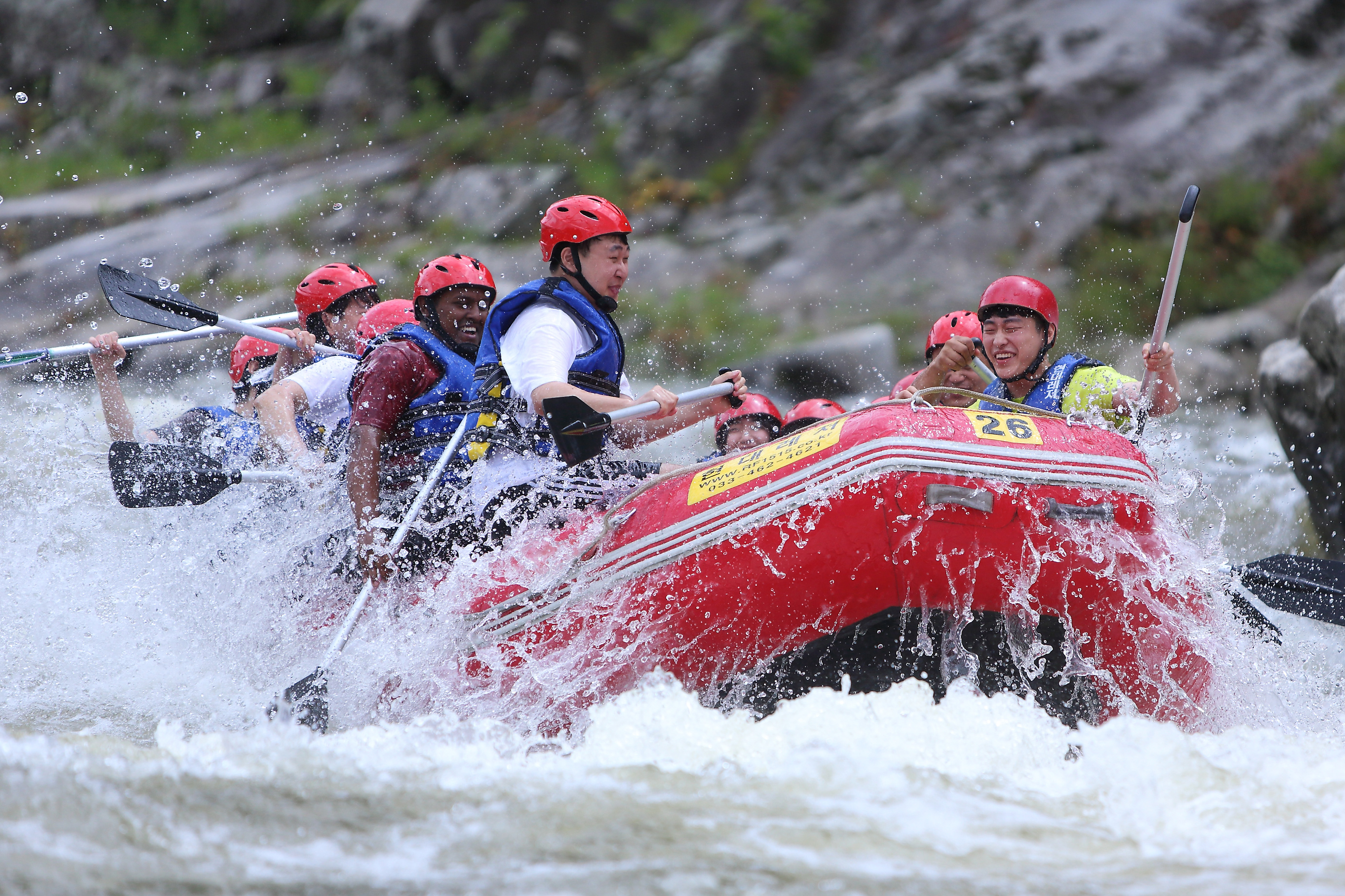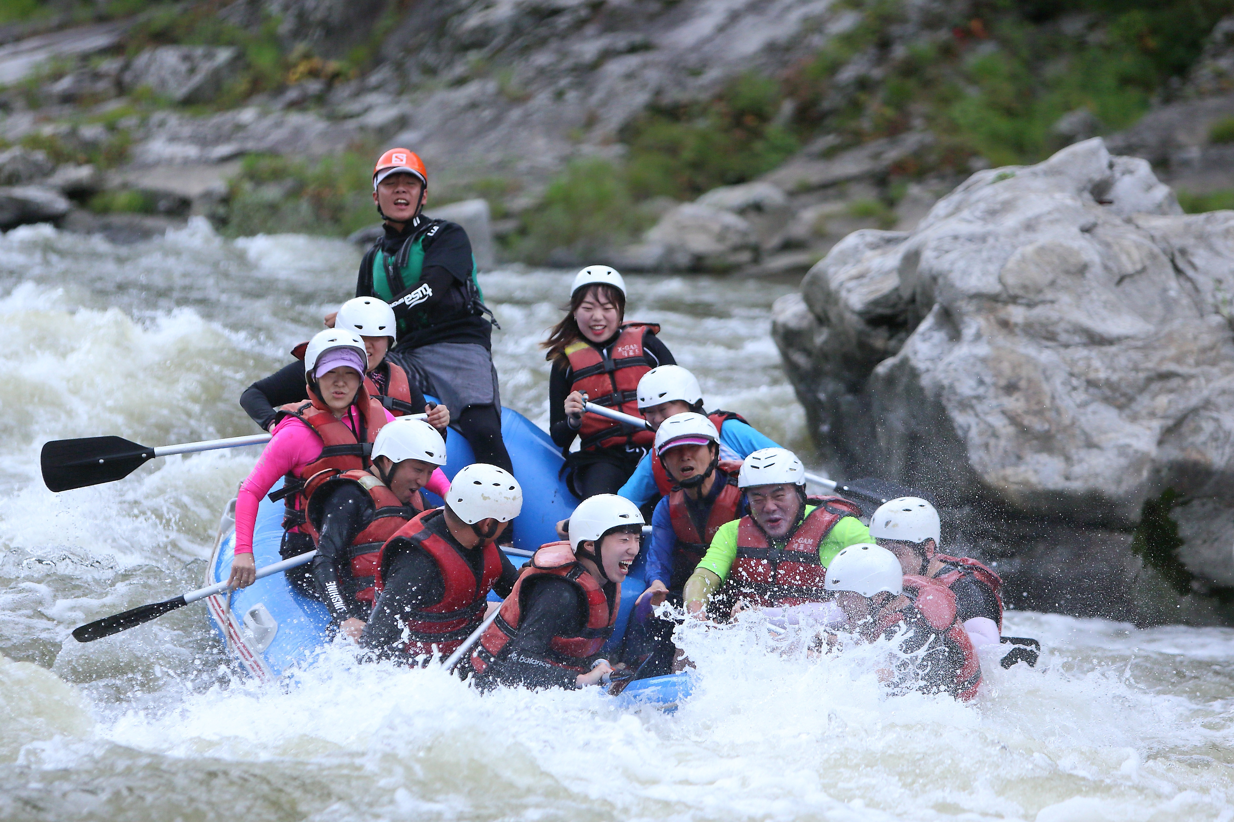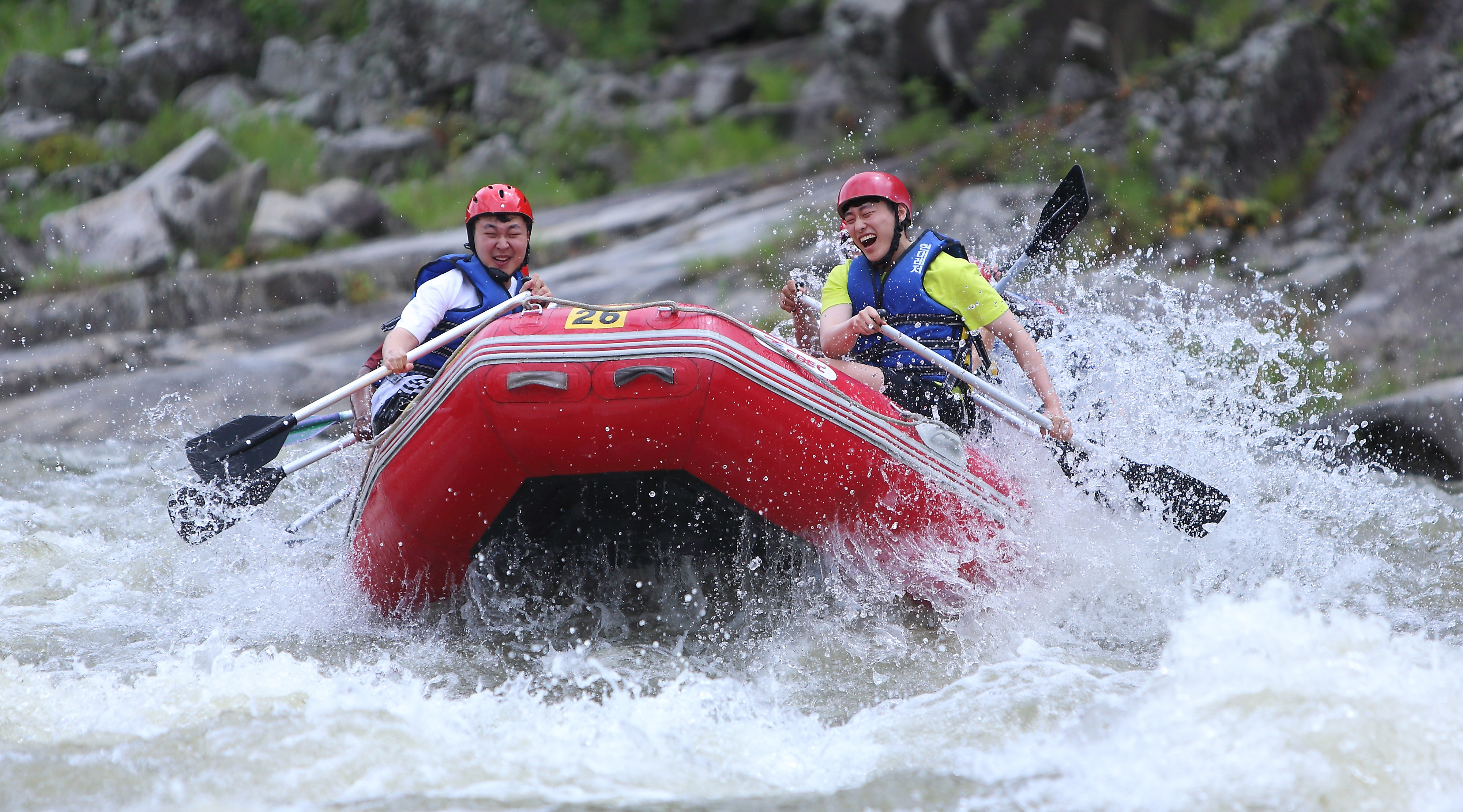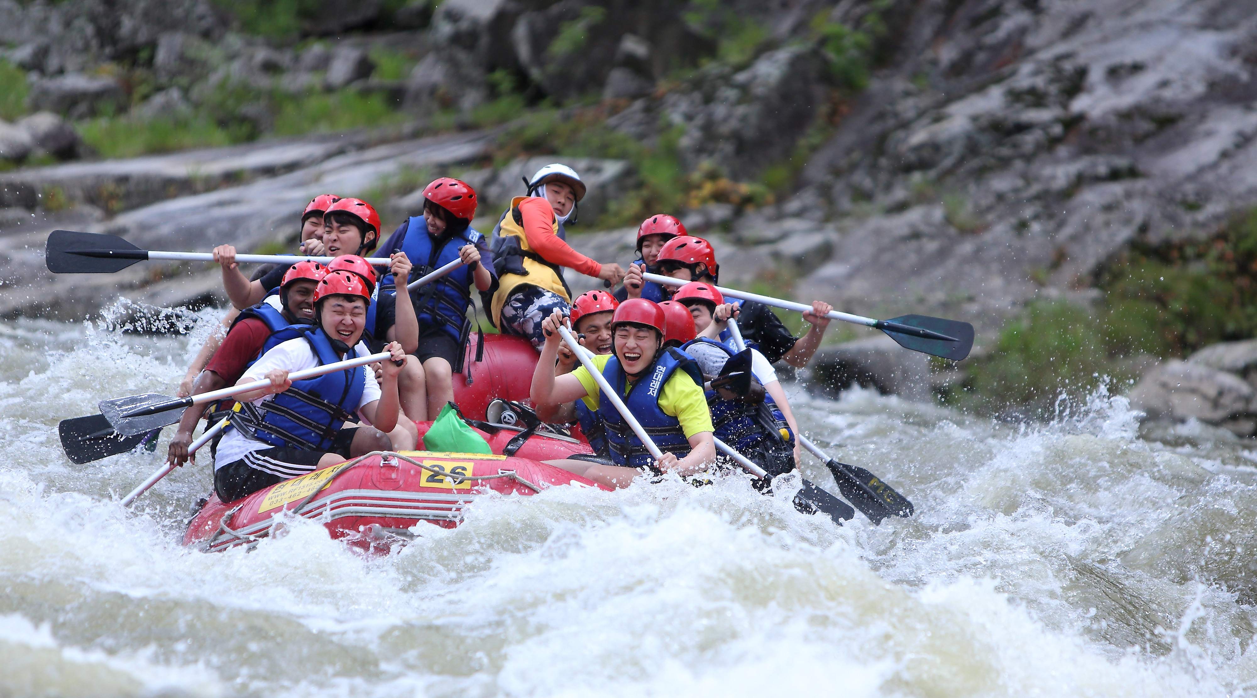 지난 주말인 13일 관광객들이 인제 내린천의 비경과 함께 시원한 물살을 가르며 스릴 만점 래프팅 체험을 즐기고 있다.