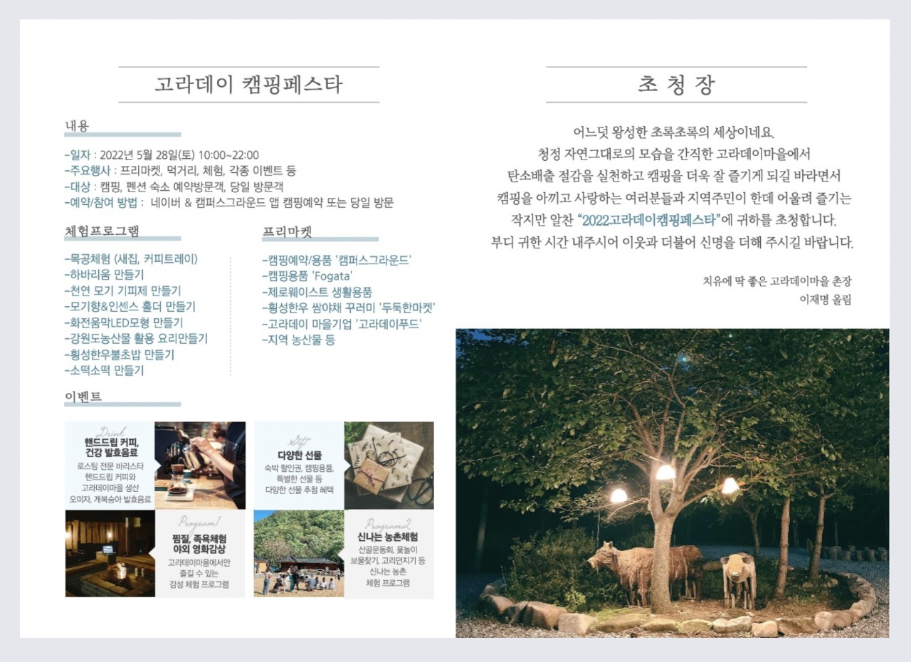 한편, 횡성군농촌체험휴양마을협의회는 4월 횡성읍 덕고마을 커피축제에 이어 청일면 고라데이마을 캠핑축제를 마련하였으며, 앞으로 공근면 벽봉마을 메리골드축제, 서원면 대산마을 김장축제 등 각 마을의 특성을 살린 축제 개최를 통해 방문객 모두가 함께할 수 있는 축제를 선보인다는 계획이다.
