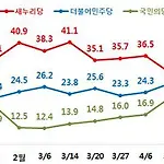 정당지지도 더민주 3위새누리당 27.7%, 국민의당 27.3%, 더불어민주당 22.9% 정당지지도는 새누리당이 지난 조사(27.8%)에 비해 0.1%p 하락한 27.7%를 유지하여 1위로 올라섰으며, 국민의당은 지난 조사결과와 동일한 27.3%을 기록하며 새누리당과 오차범위 내에 있었다. 반면, 더불어민주당은 지난 조사(28.6%)에 비해 5.7%p 하락한 22.9%를 기록하며 3위로 떨어졌다. 정의당은 9.4%, 기타/무당층은 12.6%이다. 이번 조사는 시사전문 와 조원씨앤아이가 공동으로 2016년 5월 2일~3일 2일간, 대한민국 거주 성인남녀를 대상으로 ARS여론조사(유선전화+휴대전화 RDD 방식, 성᛫연령᛫지역별 비례할당무작위추출)를 실시한 결과이며, 표본수는 1,010명(총 통화시도 33,17..